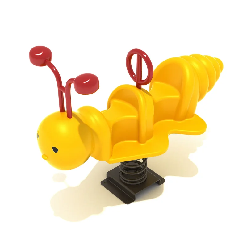 Nobody makes bumbling along more fun the than Bumbling Betsy Fun Bounce. A Sunglow Yellow bumblebee with Brick Red powder coat painted galvanized steel antenna, Betsy is ready to spring away to fun. Being a long bumblebee by nature, she is able to carry up to two passengers at a time; doubling the number of children getting to ride at once. Both the front and rear seats have secure handholds with molded footrests to give children a secure place to ride. As she can handle double the weight, she utilizes a black powder-coat painted spring to carry her riders safely. Bumbling Betsy is just one of a number of adorable animal themed spring riders that we offer. She’ll be lonely by herself, so take the time to pick out a friend or two to be her pals on the playground.