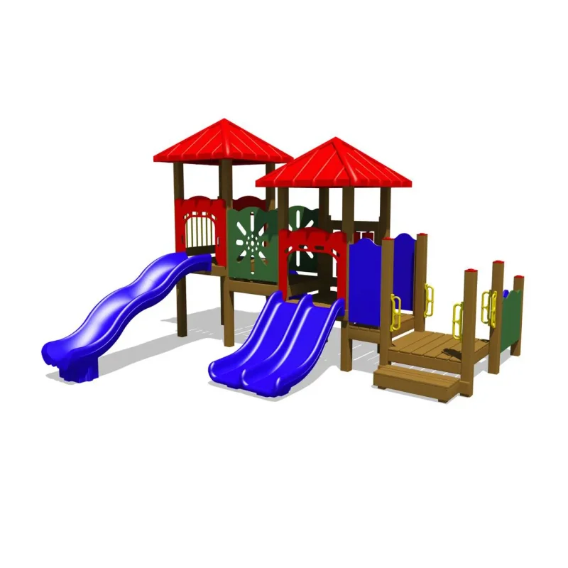 A stepped design encourages kids to really explore the Casita recycled playground. Designed for kids aged 2-12, this surprisingly feature-rich play space features two ribbed roof towers, three slides, a bedrock climber, pipe wall, and several panels that allow kids to enjoy a bit of educational fun too. With an ADA transfer station and a fun ADA driving panel, it is an entirely inclusive space, as well. Available in the range of standard recycled plastic colors, it can be as subtle or as bright as you want - either way, it will easily and instantly attract kids thanks to its appealing design and features. Capable of holding from 23-27 kids, with a use zone of 30'x31', it is a good solution for a diversity of spaces or needs. With the lengthy warranties on the parts and components (15 years on most pieces and a lifetime warranty on the recycled posts), it is going to put in many years of service and provide countless kids with great fun.