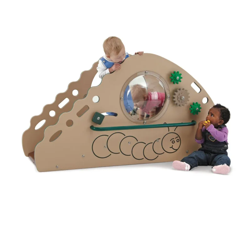 Featuring a fun caterpillar, the Cruise-A-Long with Plastisol Decking is a great unit for indoor or outdoor play. The plastisol coated steel deck is industry standard. The nature color scheme fits in with any existing equipment you have. Children ages 6 months to 2 years will love climbing up and sliding down! A bubble lets kids peek out when they reach the top. Fun interactive elements promote motor skill growth. The Cruise-A-Long with Plastisol Decking is easy to clean and easy to assemble and move around!