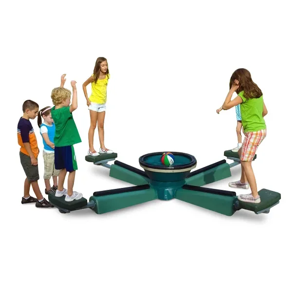 The Epicenter is an unusual playground activity which promotes balance, coordination, and teamwork. It consists of a central circular platform surrounded by four smaller stepping pads. When kids stand on the pads and lean from left to right, the central platform tilts and moves as well. This means that up to four people can influence the movements of the central circle, and vise versa. Children can try to balance a ball in the center of the structure, or a child can stand in the middle and try to keep standing while the platform shifts and shakes. The Epicenter can be fun for an individual kid, but can be wildly entertaining with larger groups. Kids will have a blast trying to tip each other over on this unique playground game.