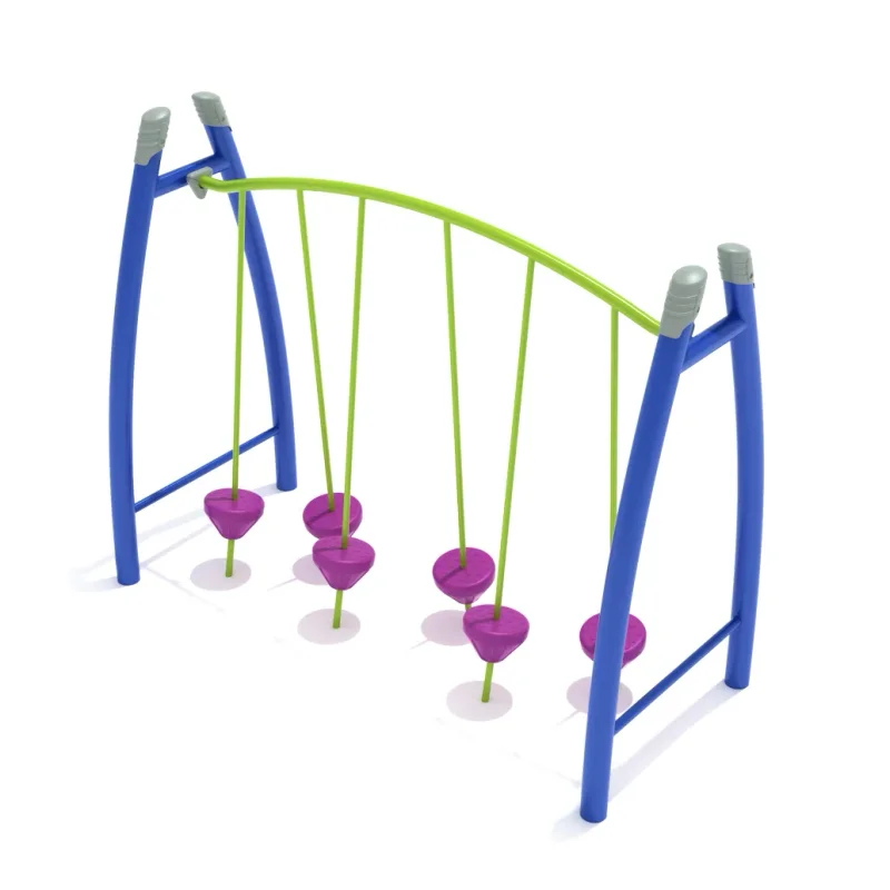 The Freestanding Curved Post Tilted Pebble Bridge is an excellent outdoor recreation unit that presents an enjoyable set of tilted platforms to maneuver across. School-age children will find their journey from end to end is enhanced by some key features of this independent play product. The curved posts at either side of the pebble trail each have a low horizontal bar that kids can use to step onto the first foothold. The round pebble steps have beneficial texturing that improves shoe grip to minimize slips. There are vertical bars that emerge through the top of each pebble that children can use to hold onto if they’re needing help staying upright. These bars are attached to the overhead rung and securely fastened into the ground to ensure each platform is stable. As each pebble step is a little bit askew, kids will have to work a bit harder as they play, encouraging improvement of their body coordination and balance control. The Freestanding Curved Post Tilted Pebble Bridge can be pur...