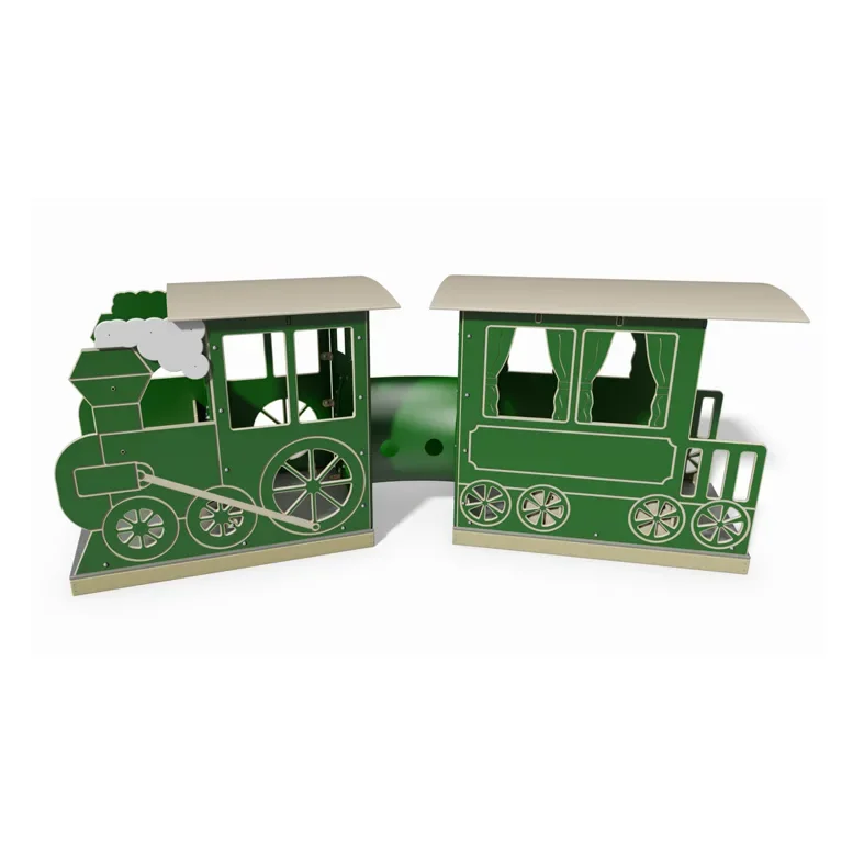 Choo Choooo! Traverse the landscape in style with our gorgeous and lifelike Freight Train. Every kid’s dream, the Freight Train features two cars connected by way of a crawl-through tunnel and fits up to eight children ages two to five comfortably. Rendered in hunter green plastic, and boasting incredibly detailed cutouts and accents, like spoked wheels, lacy curtains, an open caboose, and a plume of ivory smoke, the Freight Train is sure to facilitate hours of collaborative and dramatic play for kids of all ages. The Train makes the perfect addition to any park, schoolyard, or museum garden!