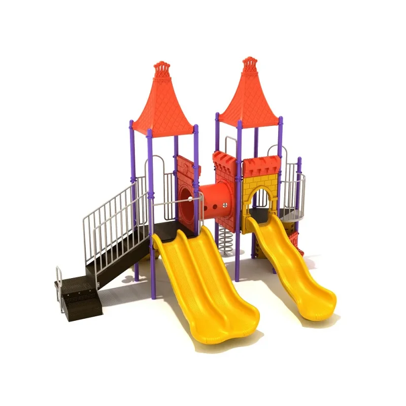 Fit for the Norse trickster god himself, Loki’s Lore is another addition to PlaygroundEquipment.com’s Castle Series of play structures. Much like the rest of the Castle Series, Loki’s Lore bears several thematic elements that serve to increase its visual appeal as well as stimulate the imaginations of all children who play on it. Starting on the ground, kids can craft a percussive rhapsody using the Bongos, or simply take a breather while sitting on the Bench Panel. The Draw Bridge Climber, the Spiral Climber, and the Castle Rock Wall Climber all provide alternative routes to the elevated portion of Loki’s Lore, where kids can descend back down to the ground using any one of the three slides, or gaze out at the rest of playground from the Balcony. With its crown-adorned twin roofs, Loki’s Lore will serve as a lodestar of creative fun for the entire playground.