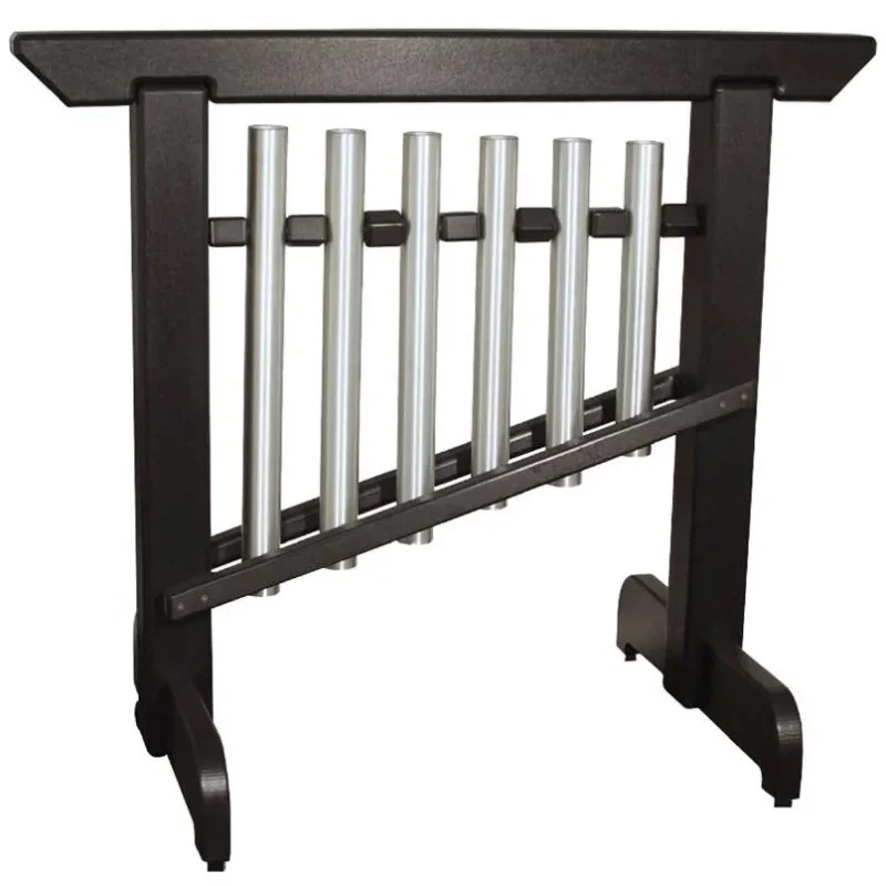 This Note Chime Unit has six chimes that each produce a beautiful reverberating tone when struck with a mallet or by hand. The six notes are carefully tuned in the G Major Pentatonic scale, which allows them to play many classic and familiar melodies. The chimes are protected by a large frame that is made entirely out of solid recycled plastic. This plastic is not only environmentally friendly, but also remarkably durable, waterproof, and easy to clean. The frame also has a simple but decorative shape which resembles a Japanese torii gate. The frame has a large base with legs that spread out to keep the instrument perfectly stable, so that none of the sound vibrations are lost. The base allows the Note Chime Unit to be moved from place to place easily, and played on just about any surface.