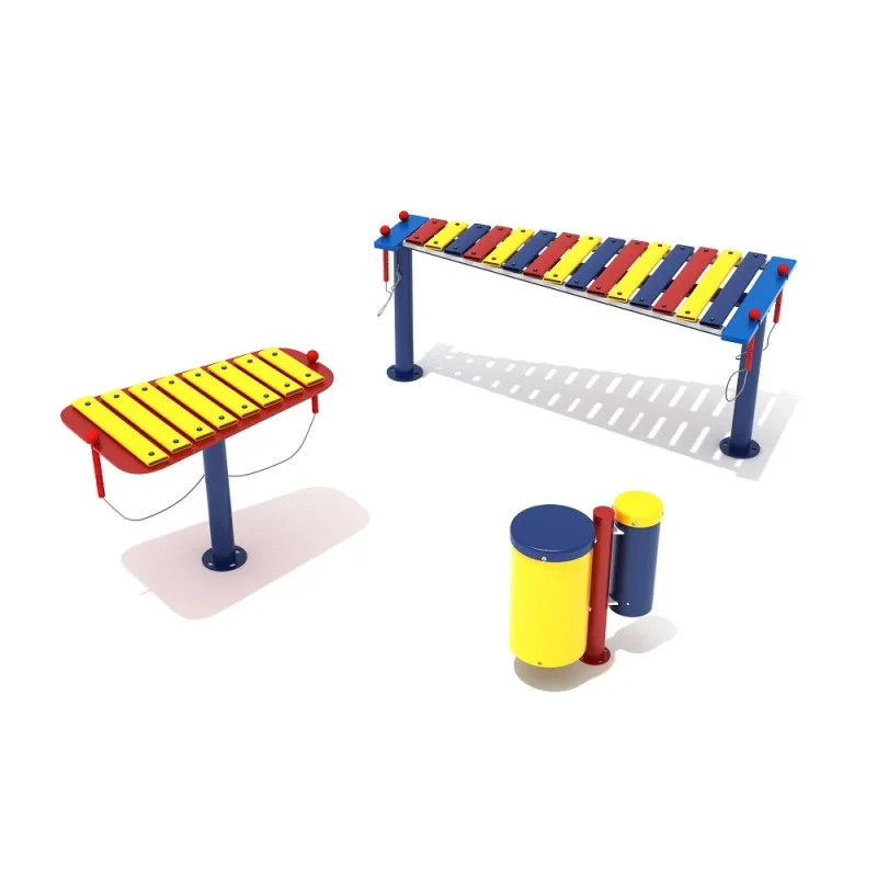 Starting a band just got easier with the Rhythm Group of Three. Composed of the Metallophone, Glockenspiel and Bongos, this set combines the symbiotic sounds of popular classic instruments for a playground concert. Grab a mallet and a friend and strike any of the fifteen different keys on the Metallophone. Accompany those delightful chimes with the ring of a solo on the Glockenspiel. And finally, someone can pound out a unique rhythm on the two differently pitched Bongo drums. Musical play promotes camaraderie and togetherness and refines motor skills in children of all ages while they compose creative tunes and perfect their pitch. Mounting options and durable materials make this package suitable for indoor and outdoor use. Purchase this convenient package to round out an existing recreation area or begin the ultimate outdoor orchestra where all future rockstars will come to rehearse. The Rhythm Group comes in two color schemes, primary and neutral, allowing it to blend seamlessly wit...