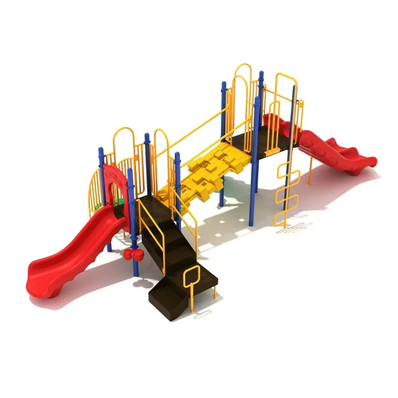 With Sailor’s Shanty, kids can engage in a variety of engaging playground activities. Utilizing a single and double slide as well as two climbers, Sailor’s Shanty has enough room for several kids at once to play. The double slide is a great feature for those who enjoy sliding with a friend; the single slide, on the other hand, is located on the other side of the structure and functions as a nice first stop for kids playing on Sailor’s Shanty. When kids are ready to move on from the single slide, they can use the pebble climber stairs to surmount the first half of the structure, then cross the pixel climber bridge to the other side, where they’ll find a rock climber and an alternating vertical climber to complement the double slide. Sailor’s Shanty even features two ground-level play options; a set of drums near the base of the single slide, as well as a ship’s wheel adjacent to the vertical climbing wall.
