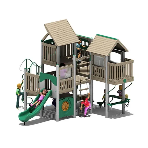 Ages 2-12: Serving a broad age range, playsets for kids aged 2-12 are great additions to daycares and childcare centers, churches, schools, parks, and public plazas. These units feature activities that all kids can enjoy such as slides, learning panels, and musical instruments while also adding formidable tests such as climbers to capture the attention of older children.