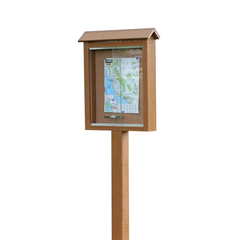 Whether you need to post an important event, a warning sign, or a trail map, the Small Message Center is the perfect size to display this information. You can order it with or without a post in standard colors of cedar or green. The post is made from solid 4-inch x 4-inch Resinwood boards and is 6’ before the install. Inside, you will appreciate high quality marine-grade cork that will not start to crumble after a couple uses like others do. Even the locking mechanisms are specially coated for durability. The Small Message Center that will stand up against environmental elements as the center itself has been crafted from various sized Resinwood slats, and the clear plastic sheet is shatter resistant. Do not trust valuable information to a low-quality message center, choose one that is weather-resistant and reliable.