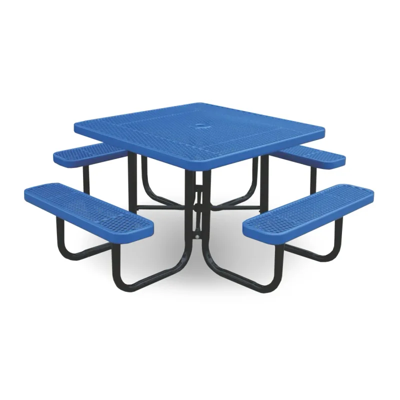 The UltraLeisure Square Portable Table by Webcoat is available with either three or four attached seats to provide seating based on your needs. Each table is constructed of expanded metal and features rolled edges for visual appeal and added protection against bumps. The portable table uses a 1-5/8-inch metal frame to keep it light and mobile while also providing a durable and strong foundation. However, if you would like to position the table in place you can buy an in-ground or surface mount to attach it to the ground (sold separately). The frame of the structure is powder-coated to enhance durability while the seats and tabletop are covered with a thermoplastic coating to protect against damage and provide UV protection. The thermoplastic helps to ensure exceptional protection against chipping, cracking, fading, and rusting even after repeated exposure to the elements. The tabletop features a hole for an optional patio umbrella to provide shade if needed.