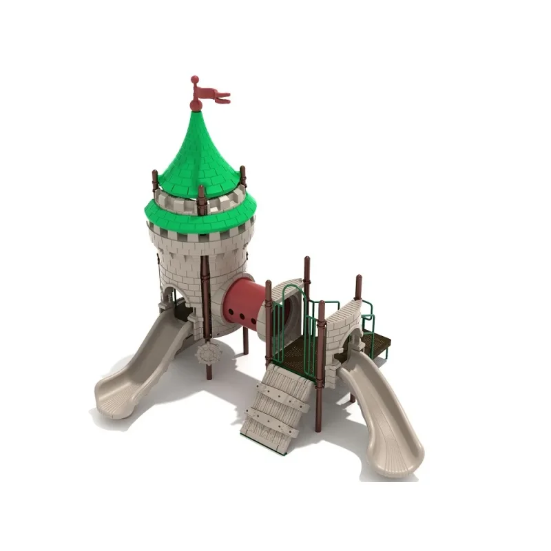 The gods will smile upon your playground-goers when they play on Valkyrie’s Villa, the latest addition to PlaygroundEquipment.com’s Castle Series. Far from an ordinary play structure, Valkyrie’s Villa boasts a unique, castle-themed design that will stimulate the imaginations of all children who play on it. Starting on the ground level, kids can play a percussive melody using the Bongos, or use the Ship’s Wheel to imagine themselves as a roving, seafaring admiral. Ascending Valkyrie’s Villa can be accomplished using the stairs or the Draw Bridge Climber, and once elevated, kids can crawl through the tube bridge to discover even more fun. The Straight Slide and the Right Turn Slide provide children the means to whoosh back down to the ground level, where they can begin their adventure anew.
